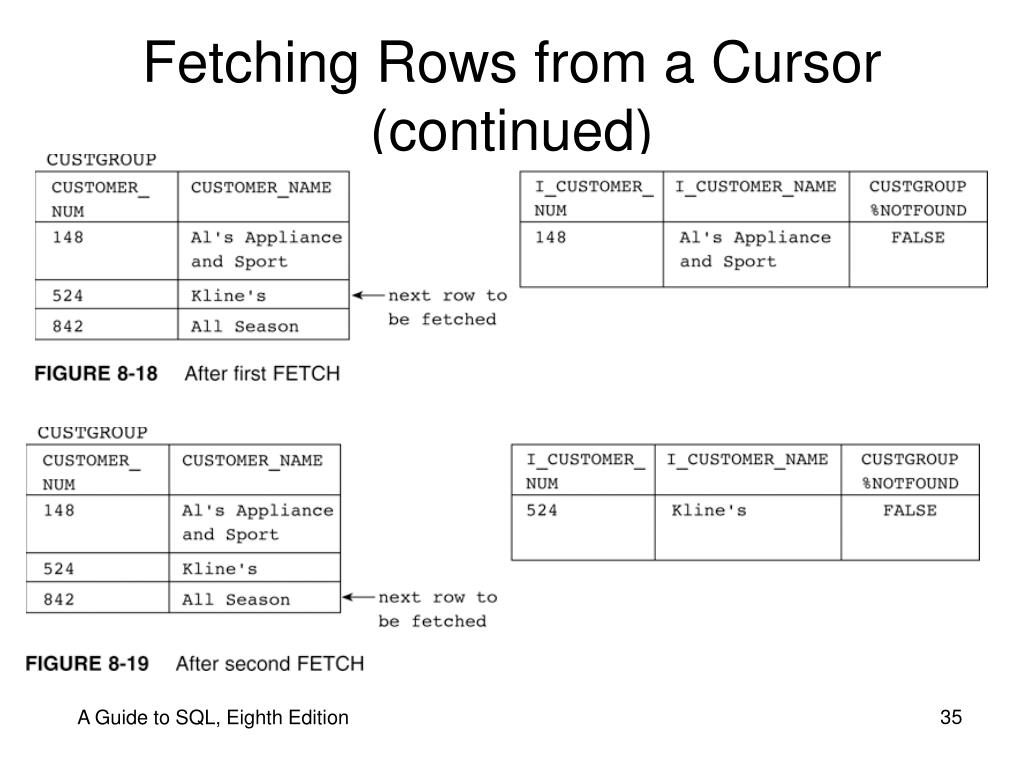 Fetching Rows from a Cursor (continued) A Guide to SQL, Eighth Edition