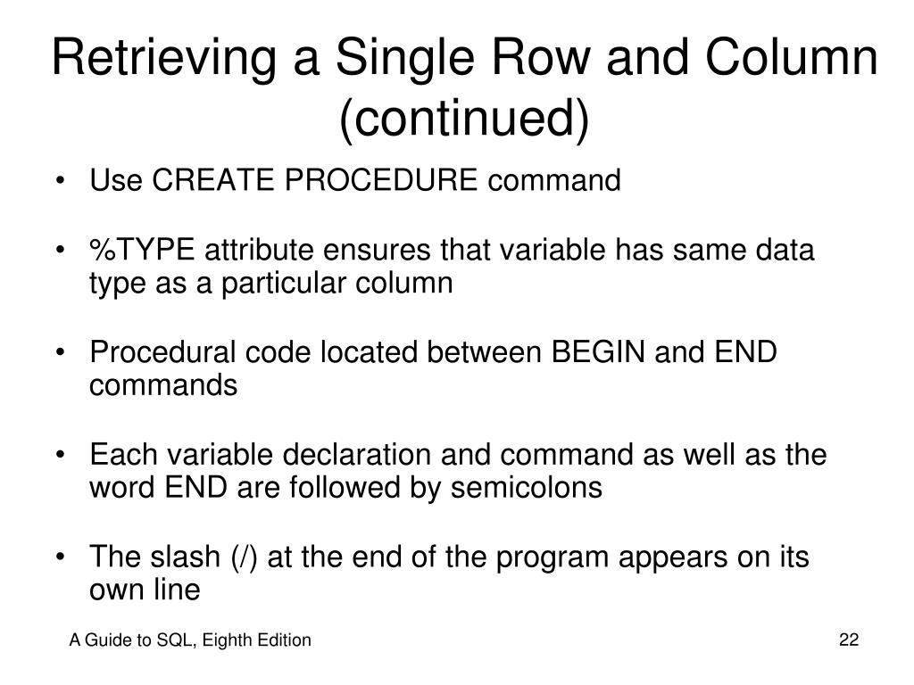 Retrieving a Single Row and Column (continued) • Use CREATE PROCEDURE command • %TYPE attribute ensures that variable has same data type as a particular column • Procedural code located between BEGIN and END commands • Each variable declaration and command as well as the word END are followed by semicolons • The slash (/) at the end of the program appears on its own line A Guide to SQL, Eighth Edition