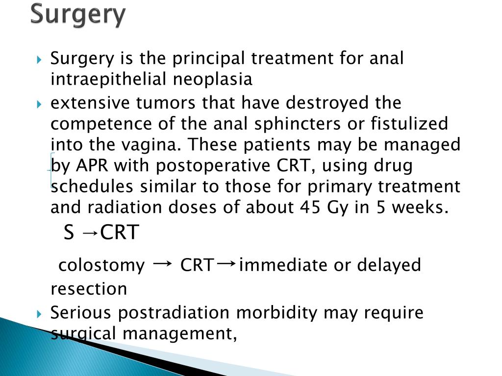 Surgery • Surgery is the principal treatment for anal intraepithelial neoplasia • extensive tumors that have destroyed the competence of the anal sphincters or fistulized into the vagina. These patients may be managed by APR with postoperative CRT, using drug schedules similar to those for primary treatment and radiation doses of about 45 Gy in 5 weeks. S →CRT colostomy → CRT→immediate or delayed resection • Serious postradiation morbidity may require surgical management,