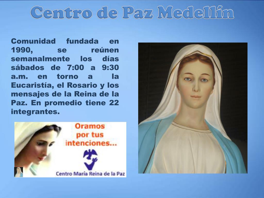 Centro de Paz Medellín Comunidad fundada en 1990, se reúnen semanalmente los días sábados de 7:00 a 9:30 a.m. en torno a la Eucaristía, el Rosario y los mensajes de la Reina de la Paz. En promedio tiene 22 integrantes.