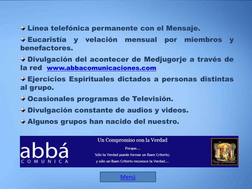 Línea telefónica permanente con el Mensaje. • Eucaristía y velación mensual por miembros y benefactores. • Divulgación del acontecer de Medjugorje a través de la red www.abbacomunicaciones.com • Ejercicios Espirituales dictados a personas distintas al grupo. • Ocasionales programas de Televisión. • Divulgación constante de audios y videos. • Algunos grupos han nacido del nuestro. Menú