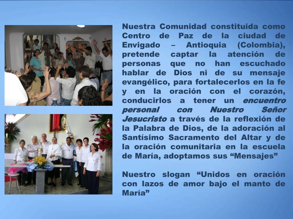 Nuestra Comunidad constituida como Centro de Paz de la ciudad de Envigado – Antioquia (Colombia), pretende captar la atención de personas que no han escuchado hablar de Dios ni de su mensaje evangélico, para fortalecerlos en la fe y en la oración con el corazón, conducirlos a tener un encuentro personal con Nuestro Señor Jesucristo a través de la reflexión de la Palabra de Dios, de la adoración al Santísimo Sacramento del Altar y de la oración comunitaria en la escuela de María, adoptamos sus “Mensajes” Nuestro slogan “Unidos en oración con lazos de amor bajo el manto de María”