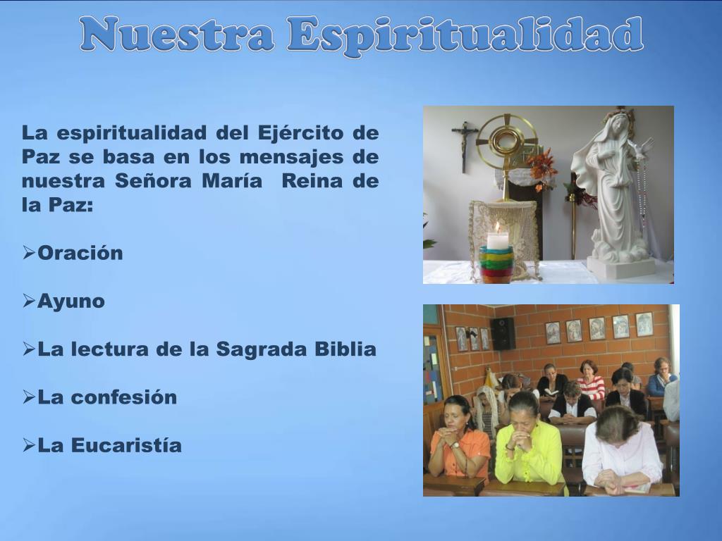 Nuestra Espiritualidad • La espiritualidad del Ejército de Paz se basa en los mensajes de nuestra Señora María Reina de la Paz: • Oración • Ayuno • La lectura de la Sagrada Biblia • La confesión • La Eucaristía