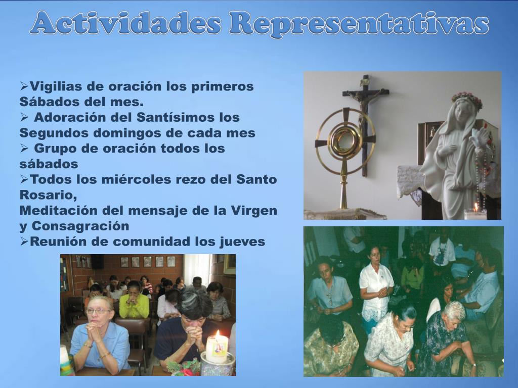 Actividades Representativas • Vigilias de oración los primeros • Sábados del mes. • Adoración del Santísimos los • Segundos domingos de cada mes • Grupo de oración todos los sábados • Todos los miércoles rezo del Santo Rosario, • Meditación del mensaje de la Virgen y Consagración • Reunión de comunidad los jueves