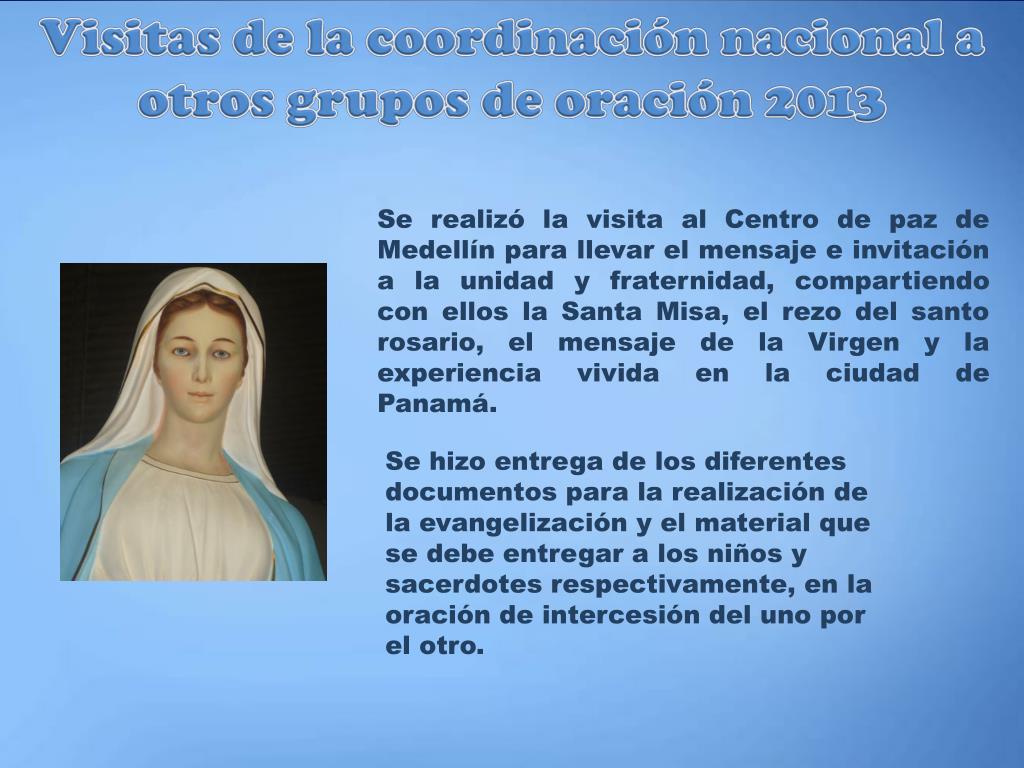 Visitas de la coordinación nacional a otros grupos de oración 2013 Se realizó la visita al Centro de paz de Medellín para llevar el mensaje e invitación a la unidad y fraternidad, compartiendo con ellos la Santa Misa, el rezo del santo rosario, el mensaje de la Virgen y la experiencia vivida en la ciudad de Panamá. Se hizo entrega de los diferentes documentos para la realización de la evangelización y el material que se debe entregar a los niños y sacerdotes respectivamente, en la oración de intercesión del uno por el otro.