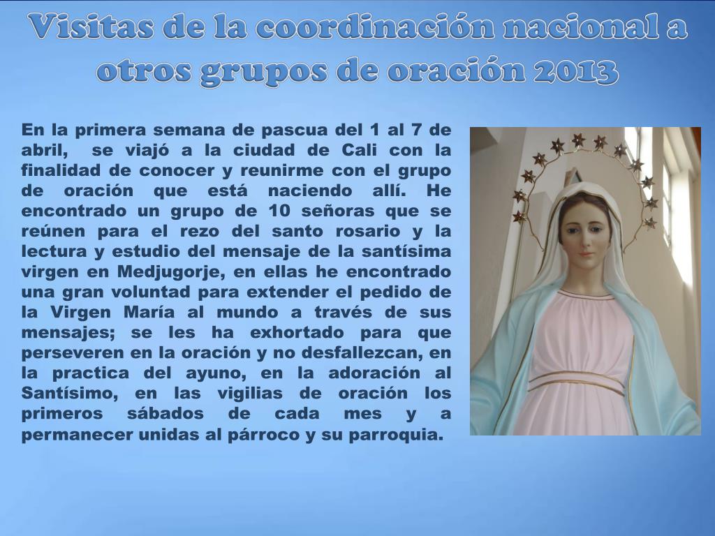 Visitas de la coordinación nacional a otros grupos de oración 2013 En la primera semana de pascua del 1 al 7 de abril, se viajó a la ciudad de Cali con la finalidad de conocer y reunirme con el grupo de oración que está naciendo allí. He encontrado un grupo de 10 señoras que se reúnen para el rezo del santo rosario y la lectura y estudio del mensaje de la santísima virgen en Medjugorje, en ellas he encontrado una gran voluntad para extender el pedido de la Virgen María al mundo a través de sus mensajes; se les ha exhortado para que perseveren en la oración y no desfallezcan, en la practica del ayuno, en la adoración al Santísimo, en las vigilias de oración los primeros sábados de cada mes y a permanecer unidas al párroco y su parroquia.