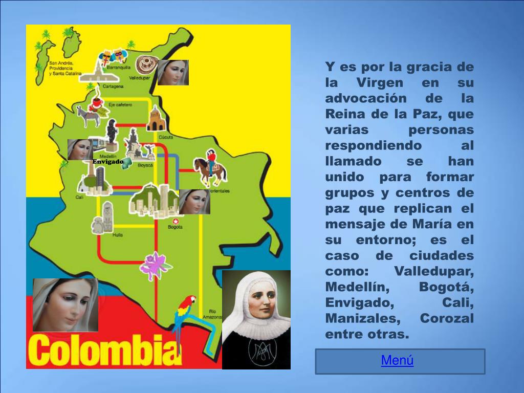 Y es por la gracia de la Virgen en su advocación de la Reina de la Paz, que varias personas respondiendo al llamado se han unido para formar grupos y centros de paz que replican el mensaje de María en su entorno; es el caso de ciudades como: Valledupar, Medellín, Bogotá, Envigado, Cali, Manizales, Corozal entre otras. Envigado Menú