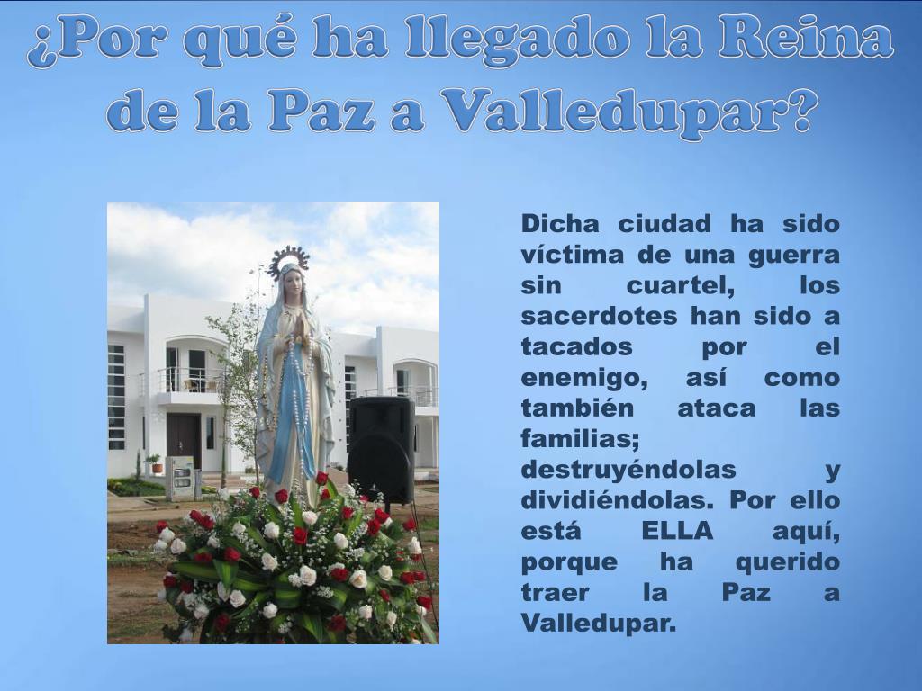 ¿Por qué ha llegado la Reina de la Paz a Valledupar? Dicha ciudad ha sido víctima de una guerra sin cuartel, los sacerdotes han sido a tacados por el enemigo, así como también ataca las familias; destruyéndolas y dividiéndolas. Por ello está ELLA aquí, porque ha querido traer la Paz a Valledupar.