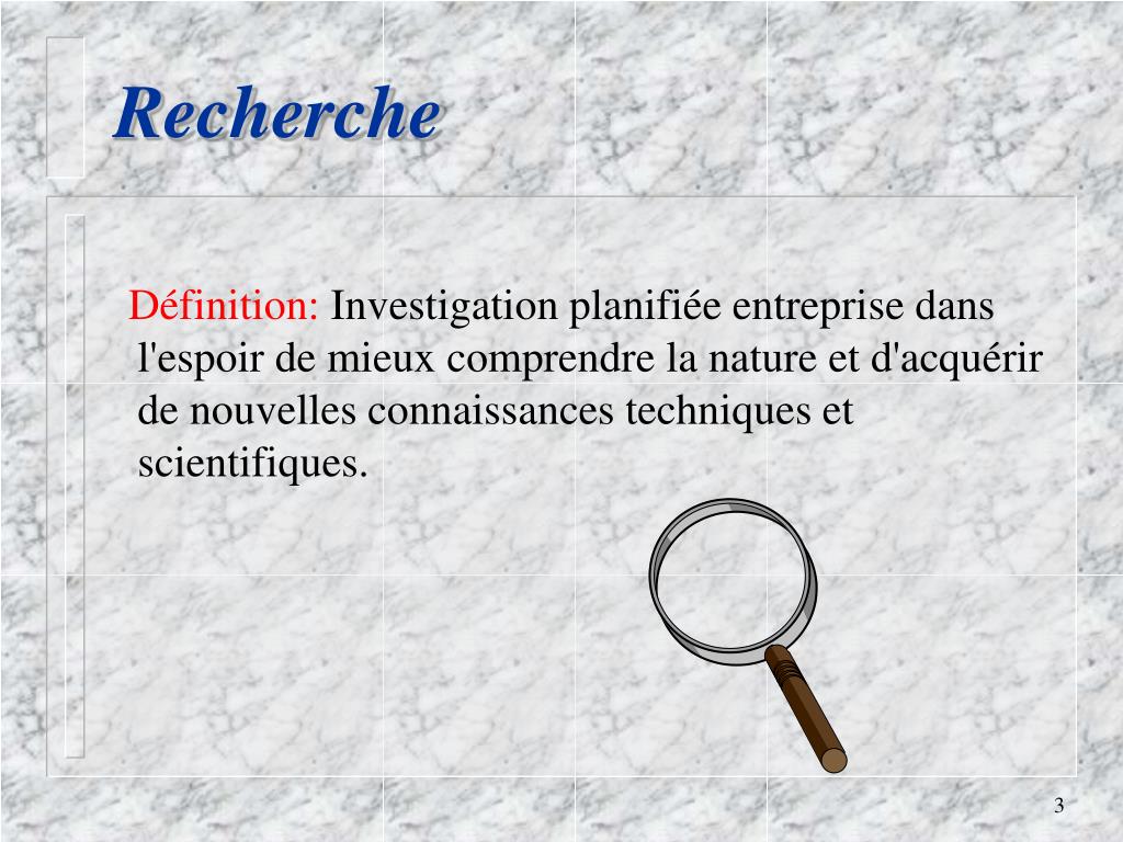 Définition: Investigation planifiée entreprise dans l'espoir de mieux comprendre la nature et d'acquérir de nouvelles connaissances techniques et scientifiques. Recherche