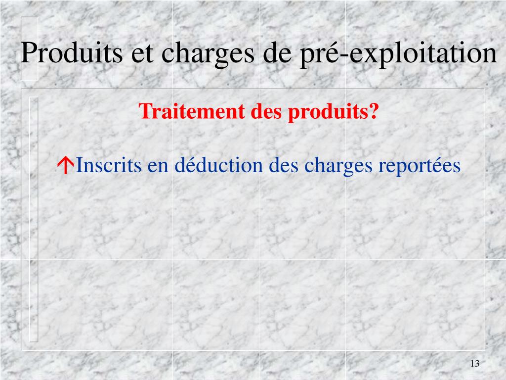 Produits et charges de pré-exploitationTraitement des produits? • Inscrits en déduction des charges reportées