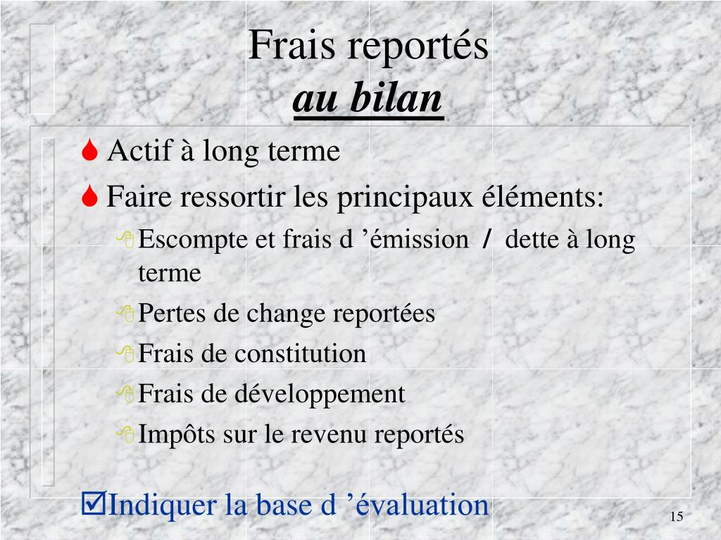 Frais reportésau bilan • Actif à long terme • Faire ressortir les principaux éléments: • Escompte et frais d ’émission / dette à long terme • Pertes de change reportées • Frais de constitution • Frais de développement • Impôts sur le revenu reportés • Indiquer la base d ’évaluation