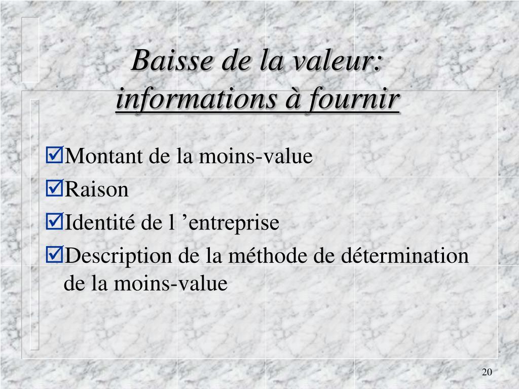 Baisse de la valeur: informations à fournir • Montant de la moins-value • Raison • Identité de l ’entreprise • Description de la méthode de détermination de la moins-value
