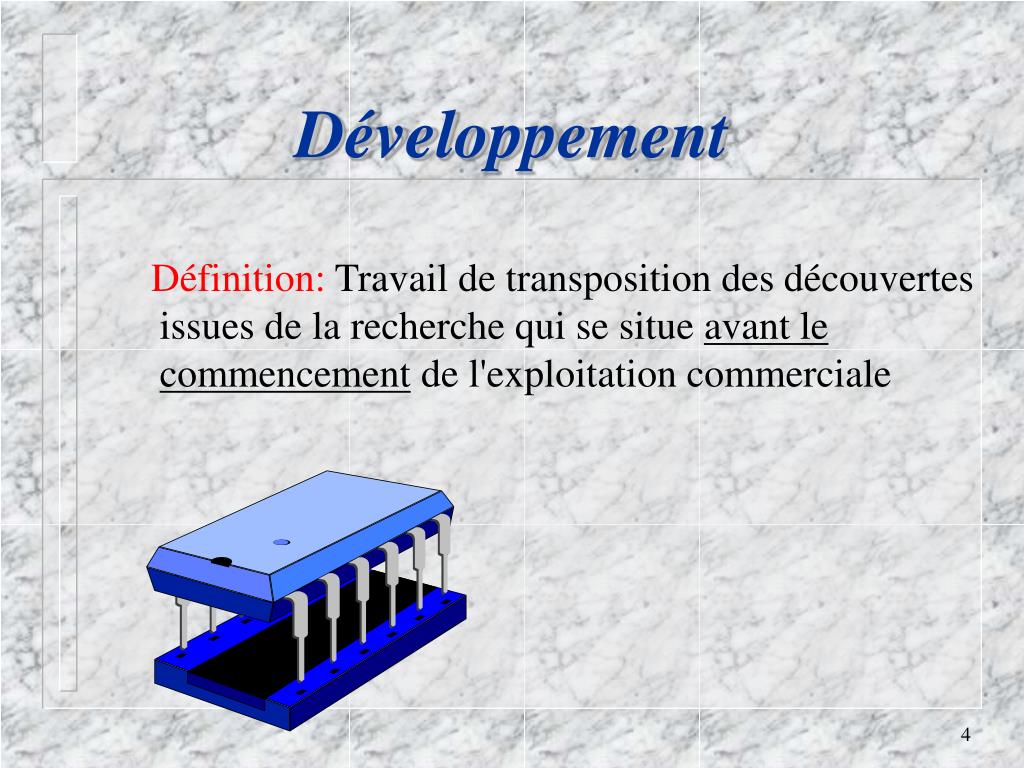 Développement Définition: Travail de transposition des découvertes issues de la recherche qui se situe avant le commencement de l'exploitation commerciale