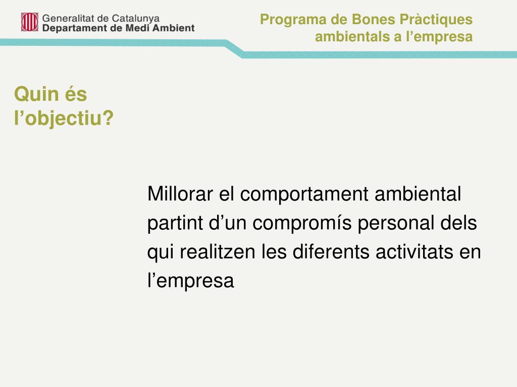 Quin és l’objectiu? Millorar el comportament ambiental partint d’un compromís personal dels qui realitzen les diferents activitats en l’empresa