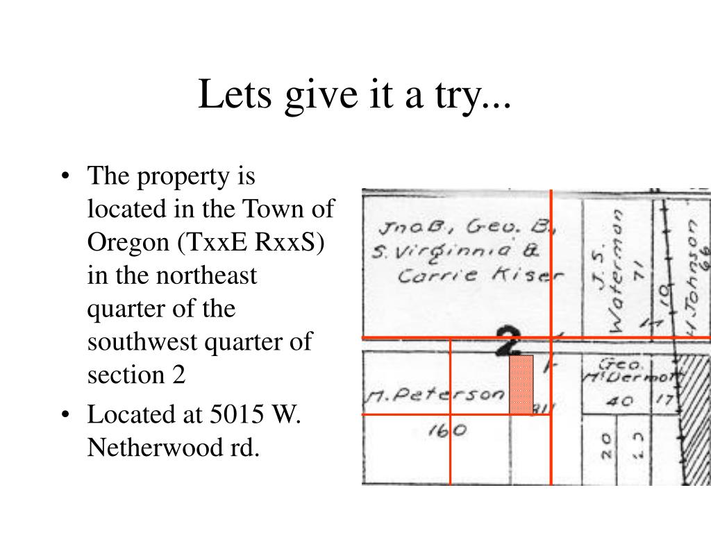 Lets give it a try... • The property is located in the Town of Oregon (TxxE RxxS) in the northeast quarter of the southwest quarter of section 2 • Located at 5015 W. Netherwood rd.