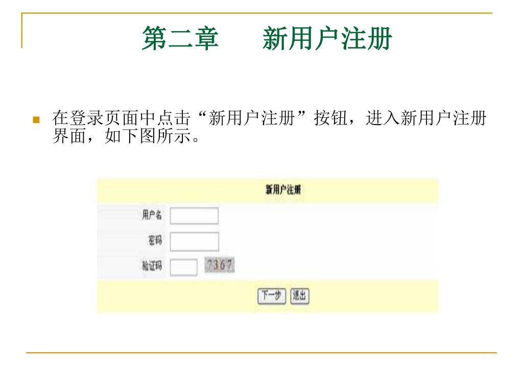 第二章 新用户注册 • 在登录页面中点击“新用户注册”按钮,进入新用户注册界面,如下图所示。