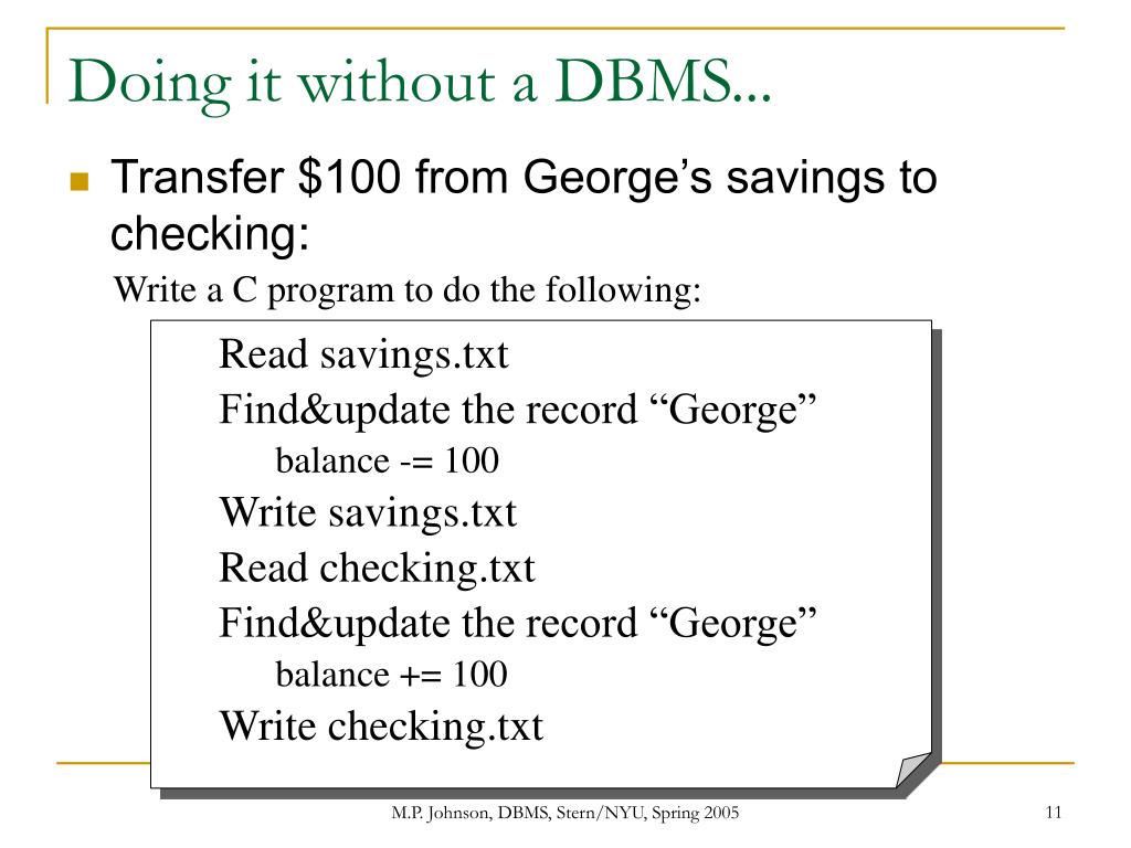 Doing it without a DBMS... • Transfer $100 from George’s savings to checking: Write a C program to do the following: • Read savings.txt • Find&update the record “George” • balance -= 100 • Write savings.txt • Read checking.txt • Find&update the record “George” • balance += 100 • Write checking.txt M.P. Johnson, DBMS, Stern/NYU, Spring 2005