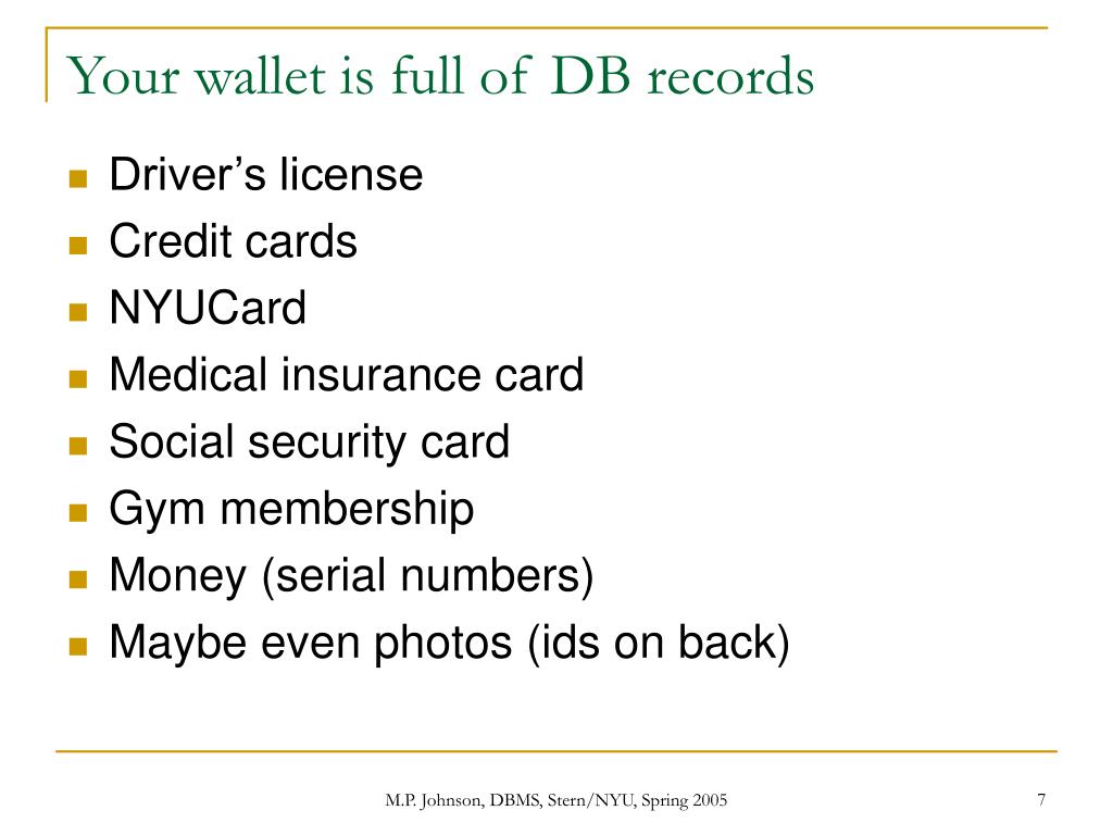 Your wallet is full of DB records • Driver’s license • Credit cards • NYUCard • Medical insurance card • Social security card • Gym membership • Money (serial numbers) • Maybe even photos (ids on back) M.P. Johnson, DBMS, Stern/NYU, Spring 2005