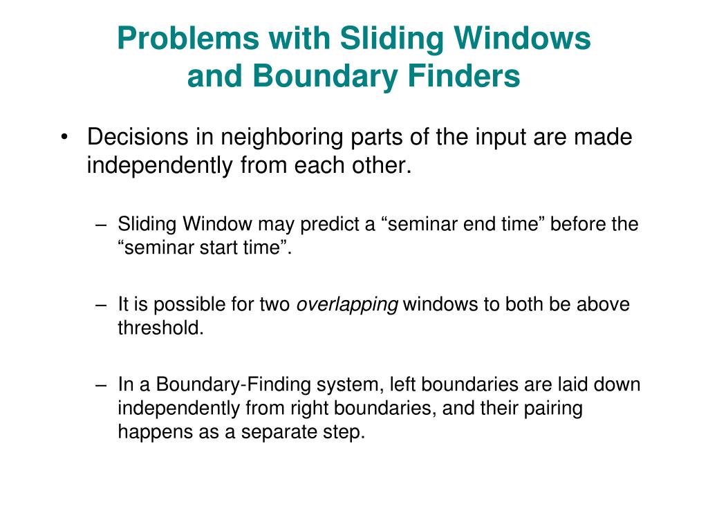 Problems with Sliding Windows and Boundary Finders • Decisions in neighboring parts of the input are made independently from each other. • Sliding Window may predict a “seminar end time” before the “seminar start time”. • It is possible for two overlapping windows to both be above threshold. • In a Boundary-Finding system, left boundaries are laid down independently from right boundaries, and their pairing happens as a separate step.