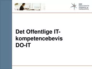 Formål • At skabe en ramme for de statslige arbejdspladser til at sikre, at medarbejderne har eller tilegner sig de grundlæggende IT-kompetencer, som vurderes at være relevante for den enkelte. • Denne ramme skal blandt andet indeholde: • Værktøjer til individuel vurdering af relevante grundlæggende IT-kompetencer • Værktøjer til måling af disse IT-kompetencer. • Sikre relevant efteruddannelsestilbud. • Procedurer for udstedelse af certifikater. • At udbrede ovenstående koncept i en række udvalgte brancher for at sikre et koncentreret kompetenceløft af de basale IT-kompetencer.