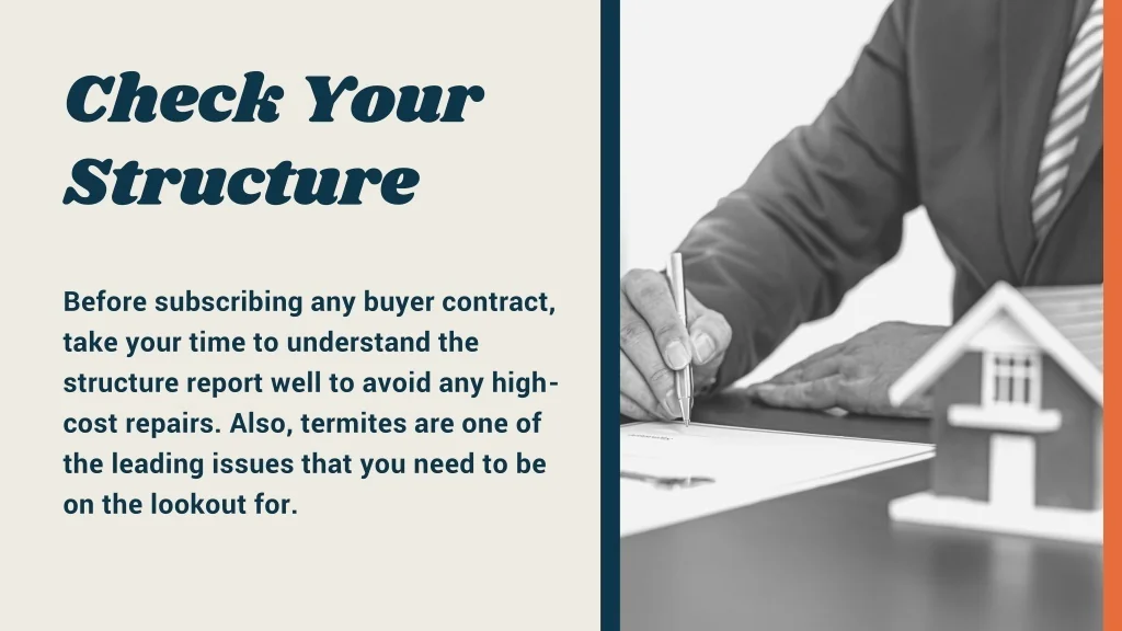 Check Your Structure • Before subscribing any buyer contract, take your time to understand the structure report well to avoid any high- cost repairs. Also, termites are one of the leading issues that you need to be on the lookout for.