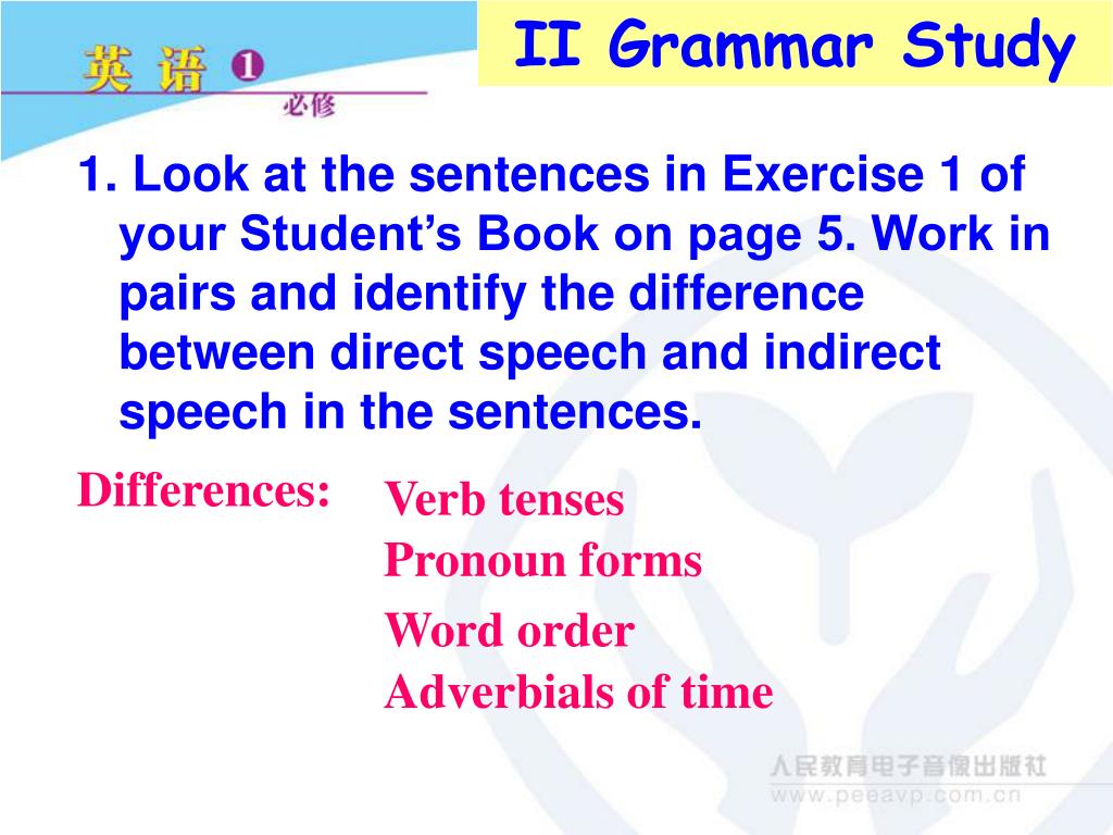 II Grammar Study 1. Look at the sentences in Exercise 1 of your Student’s Book on page 5. Work in pairs and identify the difference between direct speech and indirect speech in the sentences. Differences: Verb tenses Pronoun forms Word order Adverbials of time