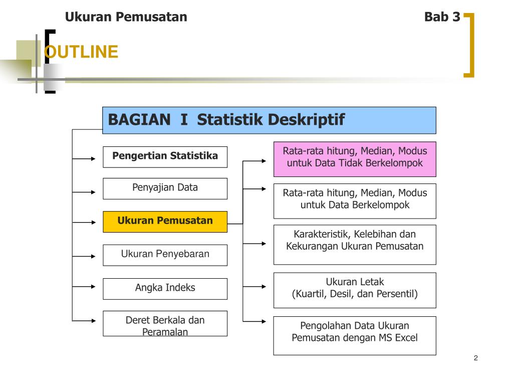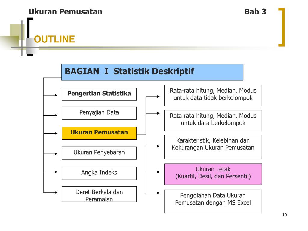 BAB 3 UKURAN PEMUSATAN. OUTLINE. Ukuran Pemusatan Bab 3. BAGIAN I Statistik Deskriptif. Rata-rata hitung, Median, Modus untuk Data Tidak Berkelompok. Pengertian Statistika. Penyajian Data. Rata-rata hitung, Median, Modus untuk Data Berkelompok. Ukuran Pemusatan.