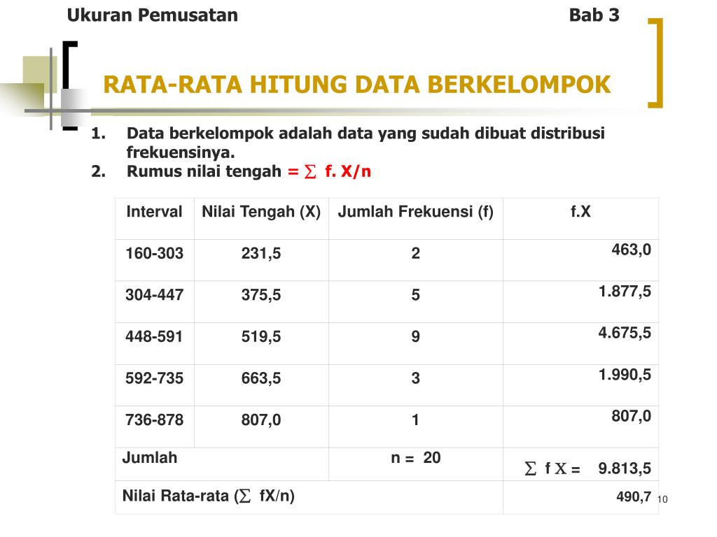 Ukuran Pemusatan Bab 3 RATA-RATA HITUNG DATA BERKELOMPOK • Setiap kelompok baik dalam bentuk skala interval maupun rasio mempunyai rata-rata hitung. • Semua nilai data harus dimasukkan ke dalam perhitungan rata-rata hitung. • Satu kelompok baik kelas maupun satu kesatuan dalam populasi dan sampel hanya mempunyai satu rata-rata hitung. • Rata-rata hitung untuk membandingkan karakteristik dua atau lebih populasi atau sampel.