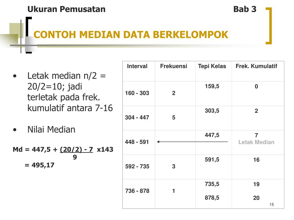 Interval Frekuensi Tepi Kelas Frek. Kumulatif Ukuran PemusatanBab 3 160 - 303 2 159,5 0 304 - 447 5 303,5 2 448 - 591 447,5 7 Letak Median 592 - 735 3 591,5 16 736 - 878 1 735,5 878,5 19 20 CONTOH MEDIAN DATA BERKELOMPOK • Letak median n/2 = 20/2=10; jadi terletak pada frek. kumulatif antara 7-16 • Nilai Median • Md = 447,5 + (20/2) - 7 x143 • 9 • = 495,17 9