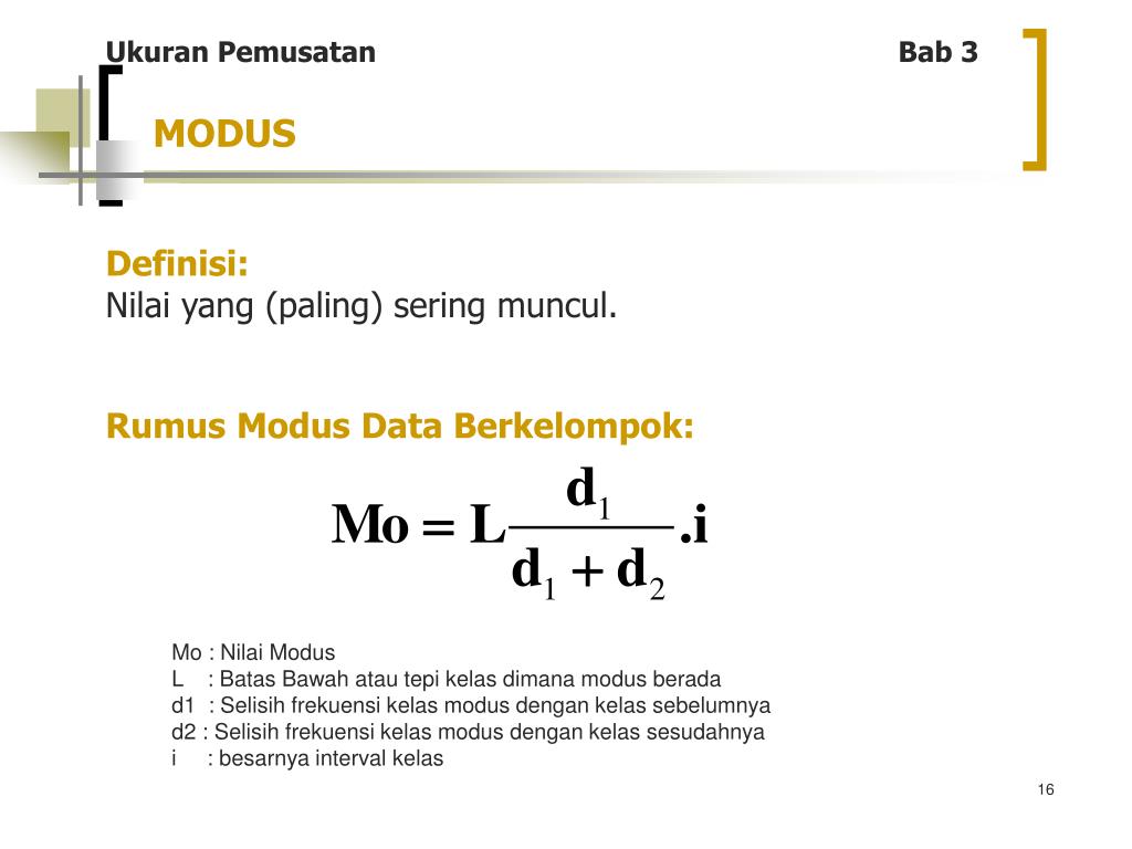 Ukuran Pemusatan Bab 3 MODUS Definisi: Nilai yang (paling) sering muncul. Rumus Modus Data Berkelompok: Mo : Nilai Modus L : Batas Bawah atau tepi kelas dimana modus berada d1 : Selisih frekuensi kelas modus dengan kelas sebelumnya d2 : Selisih frekuensi kelas modus dengan kelas sesudahnya i : besarnya interval kelas
