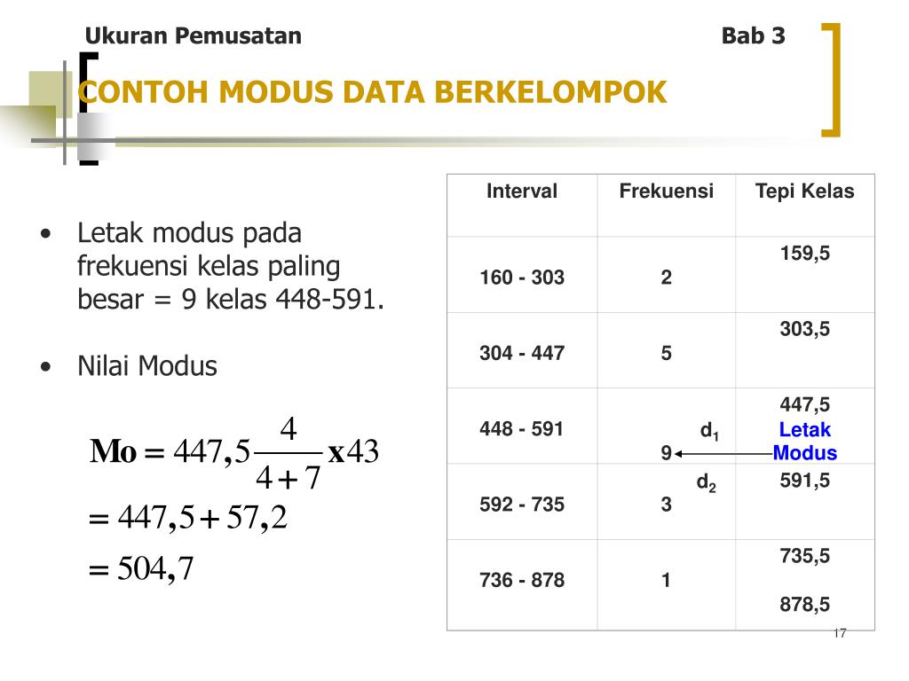 Interval Frekuensi Tepi Kelas 160 - 303 2 159,5 304 - 447 5 303,5 448 - 591 d1 9 447,5 Letak Modus 592 - 735 d2 3 591,5 736 - 878 1 735,5 878,5 Ukuran Pemusatan Bab 3 CONTOH MODUS DATA BERKELOMPOK • Letak modus pada frekuensi kelas paling besar = 9 kelas 448-591. • Nilai Modus 9