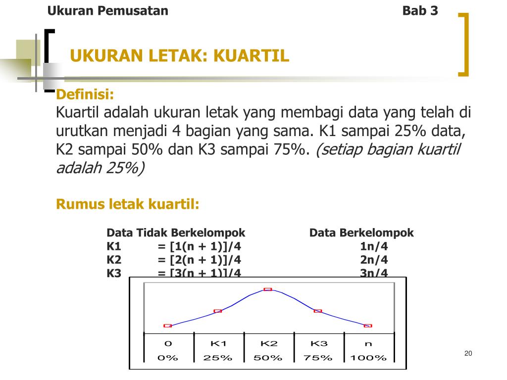 Ukuran Pemusatan Bab 3 UKURAN LETAK: KUARTIL Definisi: Kuartil adalah ukuran letak yang membagi data yang telah di urutkan menjadi 4 bagian yang sama. K1 sampai 25% data, K2 sampai 50% dan K3 sampai 75%.(setiap bagian kuartil adalah 25%) Rumus letak kuartil: Data Tidak Berkelompok Data Berkelompok K1 = [1(n + 1)]/4 1n/4 K2 = [2(n + 1)]/4 2n/4 K3 = [3(n + 1)]/4 3n/4