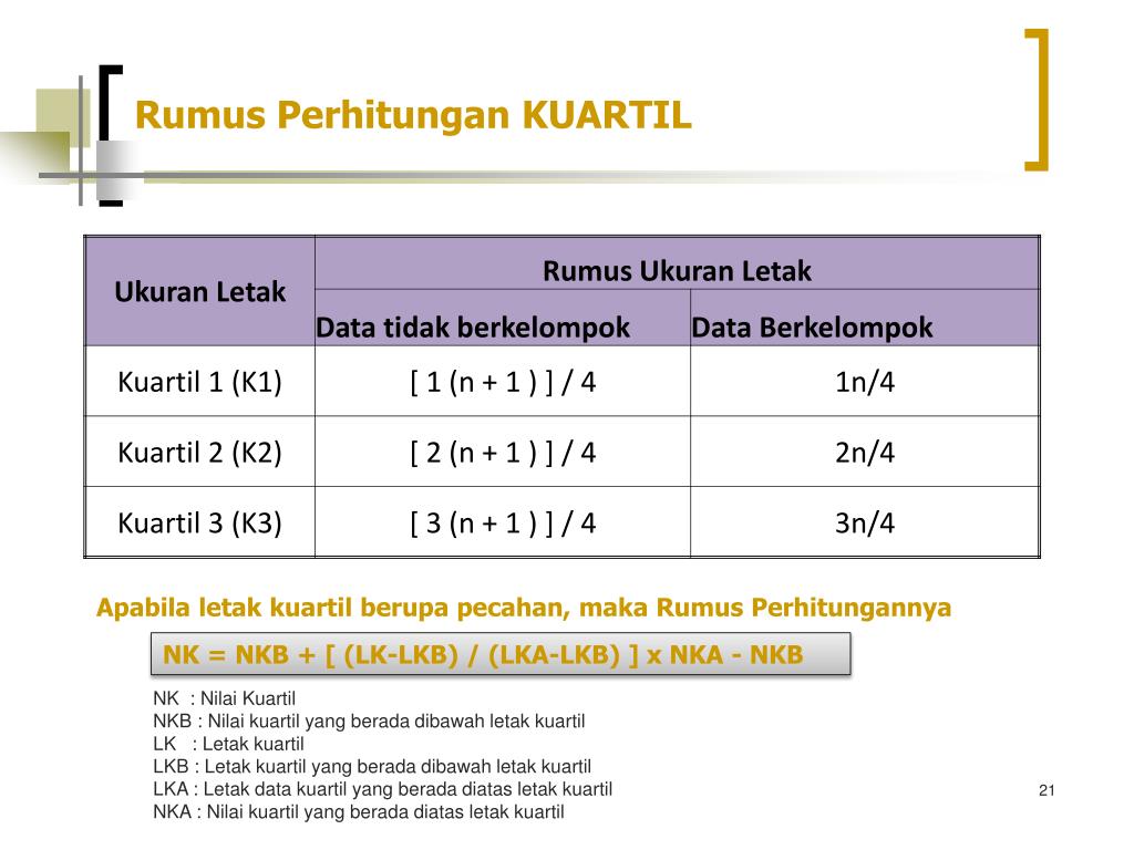Rumus Perhitungan KUARTIL Apabila letak kuartil berupa pecahan, maka Rumus Perhitungannya NK = NKB + [ (LK-LKB) / (LKA-LKB) ] x NKA - NKB NK : Nilai Kuartil NKB : Nilai kuartil yang berada dibawah letak kuartil LK : Letak kuartil LKB : Letak kuartil yang berada dibawah letak kuartil LKA : Letak data kuartil yang berada diatas letak kuartil NKA : Nilai kuartil yang berada diatas letak kuartil