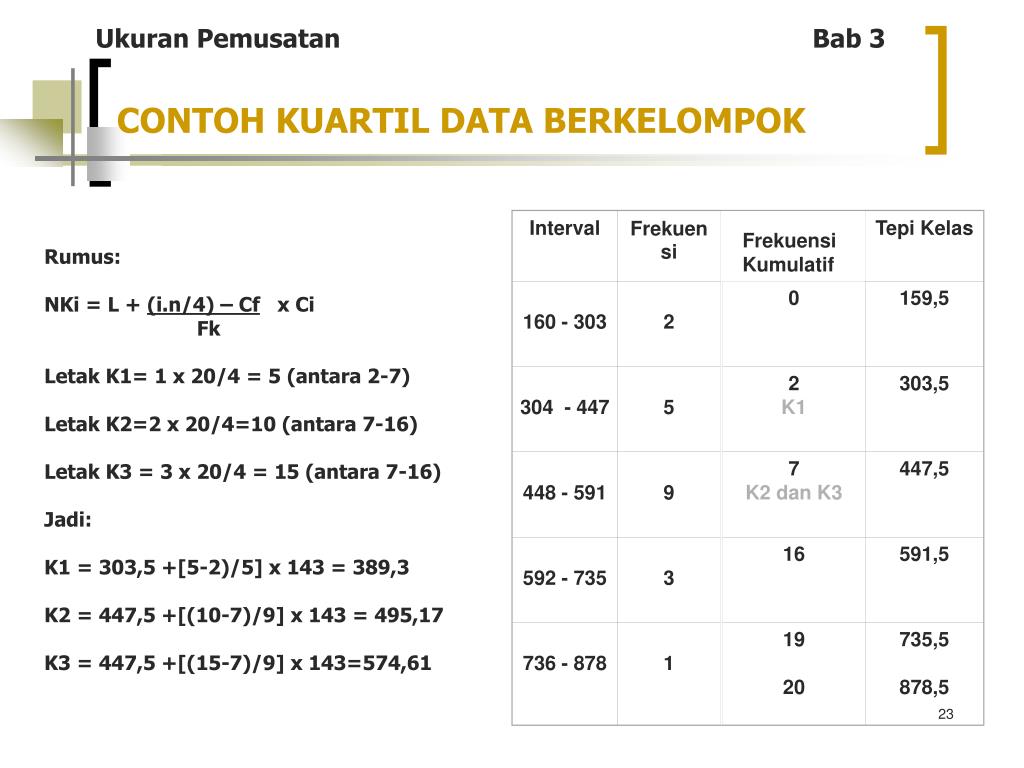 Interval Frekuen si Tepi Kelas 160 - 303 2 0 159,5 304 - 447 5 2 K1 303,5 Frekuensi Kumulatif 448 - 591 9 7 K2 dan K3 447,5 592 - 735 3 16 591,5 736 - 878 1 19 20 735,5 878,5 Ukuran Pemusatan Bab 3 CONTOH KUARTIL DATA BERKELOMPOK Rumus: NKi = L + (i.n/4) – Cf x Ci Fk Letak K1= 1 x 20/4 = 5 (antara 2-7) Letak K2=2 x 20/4=10 (antara 7-16) Letak K3 = 3 x 20/4 = 15 (antara 7-16) Jadi: K1 = 303,5 +[5-2)/5] x 143 = 389,3 K2 = 447,5 +[(10-7)/9] x 143 = 495,17 K3 = 447,5 +[(15-7)/9] x 143=574,61