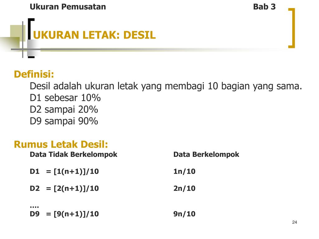 Ukuran Pemusatan Bab 3 UKURAN LETAK: DESIL Definisi: Desil adalah ukuran letak yang membagi 10 bagian yang sama. D1 sebesar 10% D2 sampai 20% D9 sampai 90% Rumus Letak Desil: Data Tidak Berkelompok Data Berkelompok D1 = [1(n+1)]/10 1n/10 D2 = [2(n+1)]/10 2n/10 …. D9 = [9(n+1)]/10 9n/10
