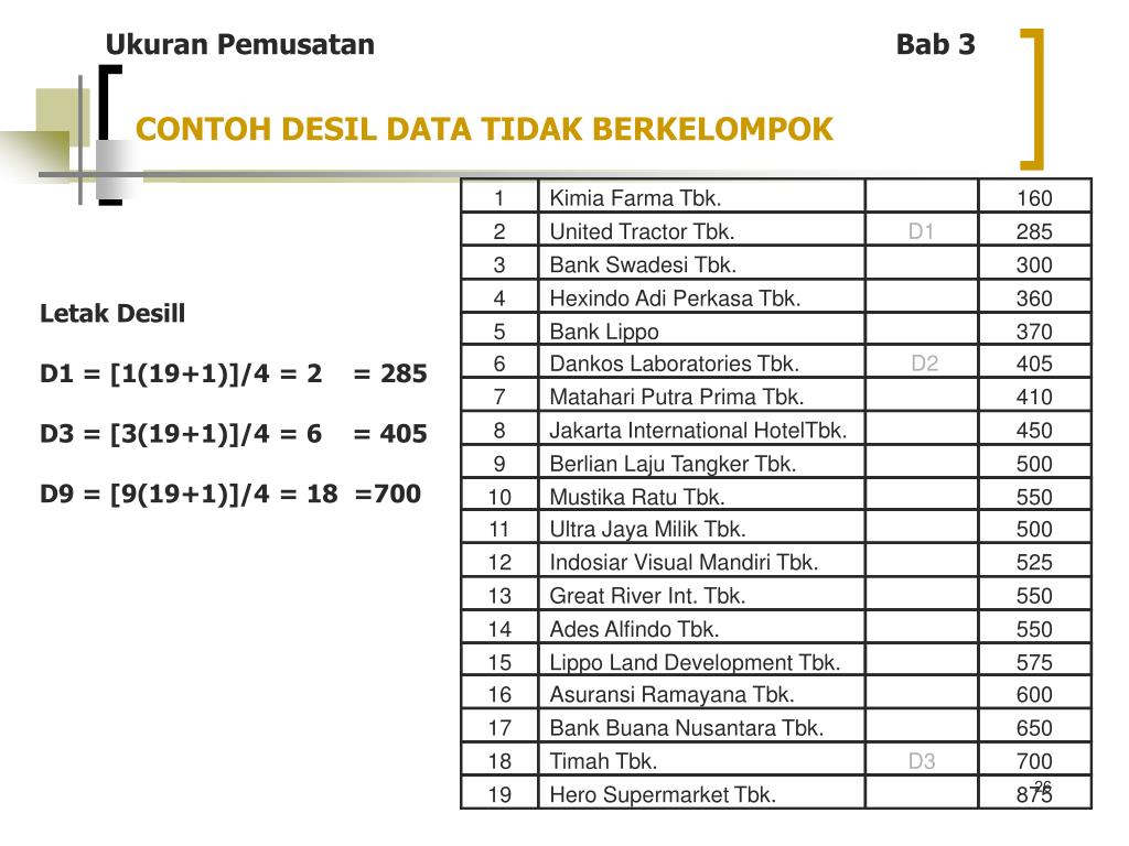 1 Kimia Farma Tbk. 160 2 United Tractor Tbk. D1 285 3 Bank Swadesi Tbk. 300 4 Hexindo Adi Perkasa Tbk. 360 5 Bank Lippo 370 6 Dankos Laboratories Tbk. D2 405 7 Matahari Putra Prima Tbk. 410 8 Jakarta International HotelTbk. 450 9 Berlian Laju Tangker Tbk. 500 10 Mustika Ratu Tbk. 550 11 Ultra Jaya Milik Tbk. 500 12 Indosiar Visual Mandiri Tbk. 525 13 Great River Int. Tbk. 550 14 Ades Alfindo Tbk. 550 15 Lippo Land Development Tbk. 575 16 Asuransi Ramayana Tbk. 600 17 Bank Buana Nusantara Tbk. 650 18 Timah Tbk. D3 700 19 Hero Supermarket Tbk. 875 Ukuran Pemusatan Bab 3 CONTOH DESIL DATA TIDAK BERKELOMPOK Letak Desill D1 = [1(19+1)]/4 = 2 = 285 D3 = [3(19+1)]/4 = 6 = 405 D9 = [9(19+1)]/4 = 18 =700
