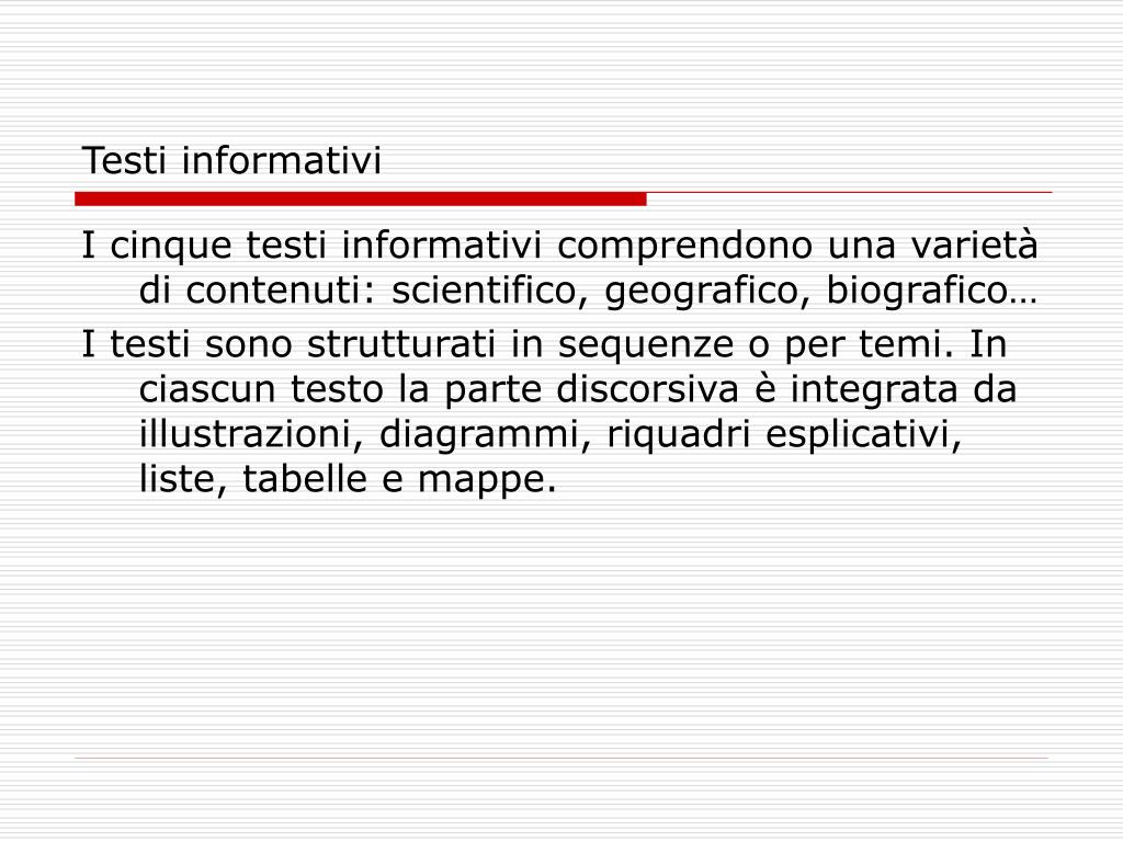 Testi informativi I cinque testi informativi comprendono una varietà di contenuti: scientifico, geografico, biografico… I testi sono strutturati in sequenze o per temi. In ciascun testo la parte discorsiva è integrata da illustrazioni, diagrammi, riquadri esplicativi, liste, tabelle e mappe.