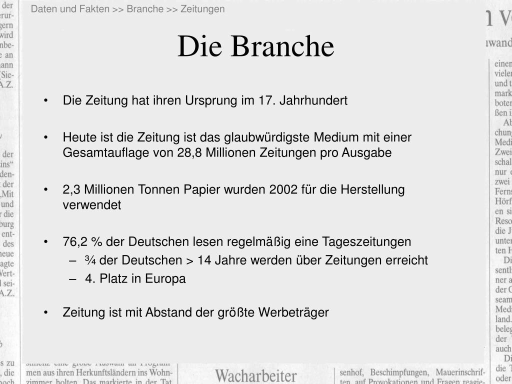 Daten und Fakten >> Branche >> Zukunftsaussichten Die Branche • Dieses Jahr mehr Arbeitstage = mehr Erscheinungstage für Tageszeitungen • Trend zur Regionalisierung • Fusionen der Verlage • Kleinere Verlage werden aufgekauft • Verlage setzten eher auf Kosteneinsparung als auf Erlössteigerung