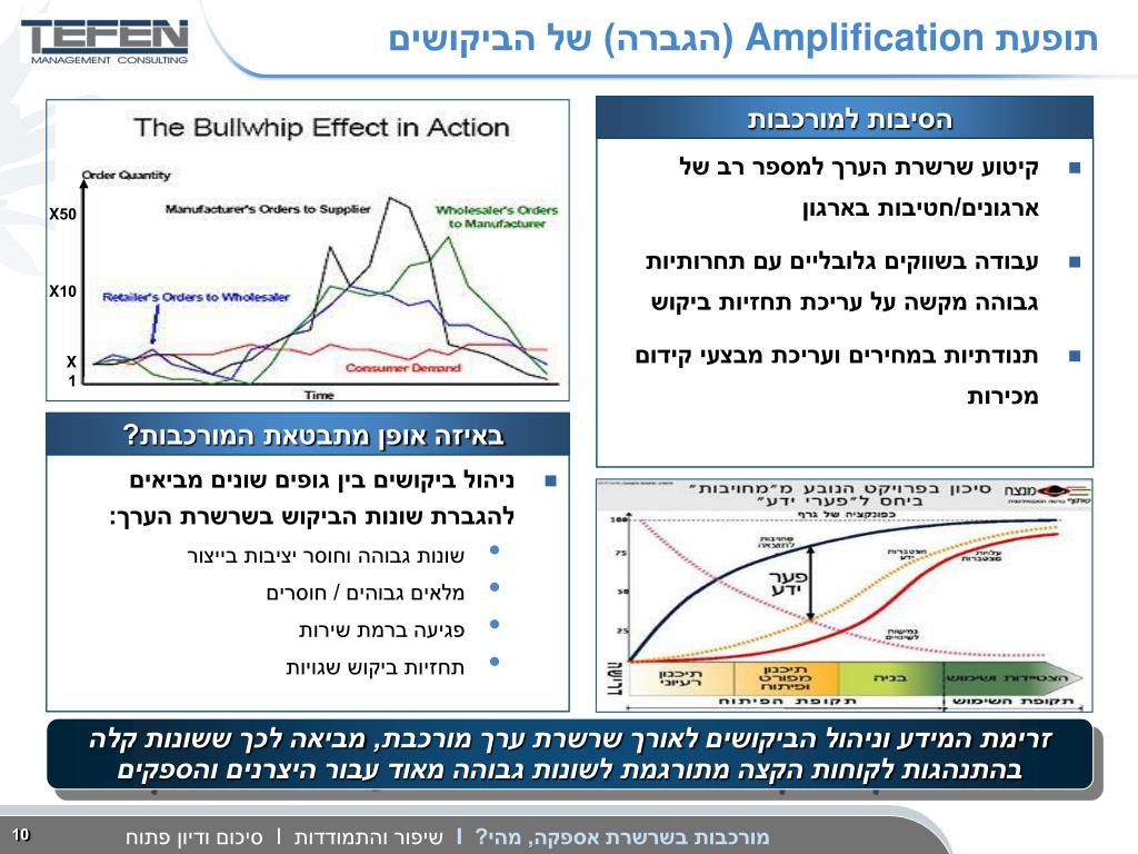 מורכבות בשרשרת האספקה – כיצד היא באה לידי ביטוי? מורכבות לוגית מורכבות פיזית דוגמאות להיבטים שונים של מורכבות בשרשרת האספקה • רכש מרכזי ו/או גלובאלי • Multi site operations • ניהול מספר רב של SKUs/שירותים • .... • זרימה ועיבוד מידע • אמפליפיקיציה (הגברה) • Make vs. Buy • .... מורכבות בשרשרת האספקה מורכבות ניהולית • ניהול לקוחות וערוצים • ניהול פרויקטים • מבנה ארגוני (חטיבתי, מטריציוני, היררכי) • .... לא במסגרת דיון זה מערכת מורכבת נוטה לשלם בעלויות תפעול גבוהות אשר לא בהכרח מביאות לערך מוסף לבעלי המניות או ללקוח מורכבות בשרשרת אספקה, מהי? Iשיפור והתמודדות I סיכום ודיון פתוח