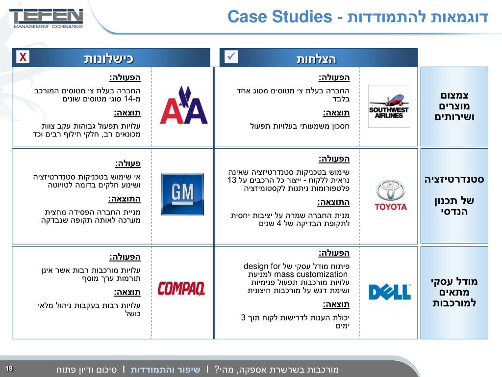 דוגמאות להתמודדות - Case Studies כישלונות הצלחות X צמצום מוצרים ושירותים הפעולה: החברה בעלת צי מטוסים המורכב מ-14 סוגי מטוסים שונים תוצאה: עלויות תפעול גבוהות עקב צוות מכונאים רב, חלקי חילוף רבים וכד הפעולה: החברה בעלת צי מטוסים מסוג אחד בלבד תוצאה: חסכון משמעותי בעלויות תפעול סטנדרטיזציה של תכנון הנדסי הפעולה: שימוש בטכניקות סטנדרטיזציה שאינה נראית ללקוח - ייצור כל הרכבים על 13 פלטפורומות ניתנות לקסטומיזציה התוצאה: מנית החברה שמרה על יציבות יחסית לתקופת הבדיקה של 4 שנים פעולה: אי שימוש בטכניקות סטנדרטיזציה ושינוע חלקים בדומה לטויוטה התוצאה: מניית החברה הפסידה מחצית מערכה לאותה תקופה שנבדקה הפעולה: פיתוח מודל עסקי שלdesign for mass customization למניעת עלויות מורכבות תפעול פנימיות ושימת דגש על מורכבות חיצונית תוצאה: יכולת הענות לדרישות לקוח תוך 3 ימים מודל עסקי מתאים למורכבות הפעולה: עלויות מורכבות רבות אשר אינן תורמות ערך מוסף תוצאה: עלויות רבות בעקבות ניהול מלאי כושל מורכבות בשרשרת אספקה, מהי? Iשיפור והתמודדות I סיכום ודיון פתוח