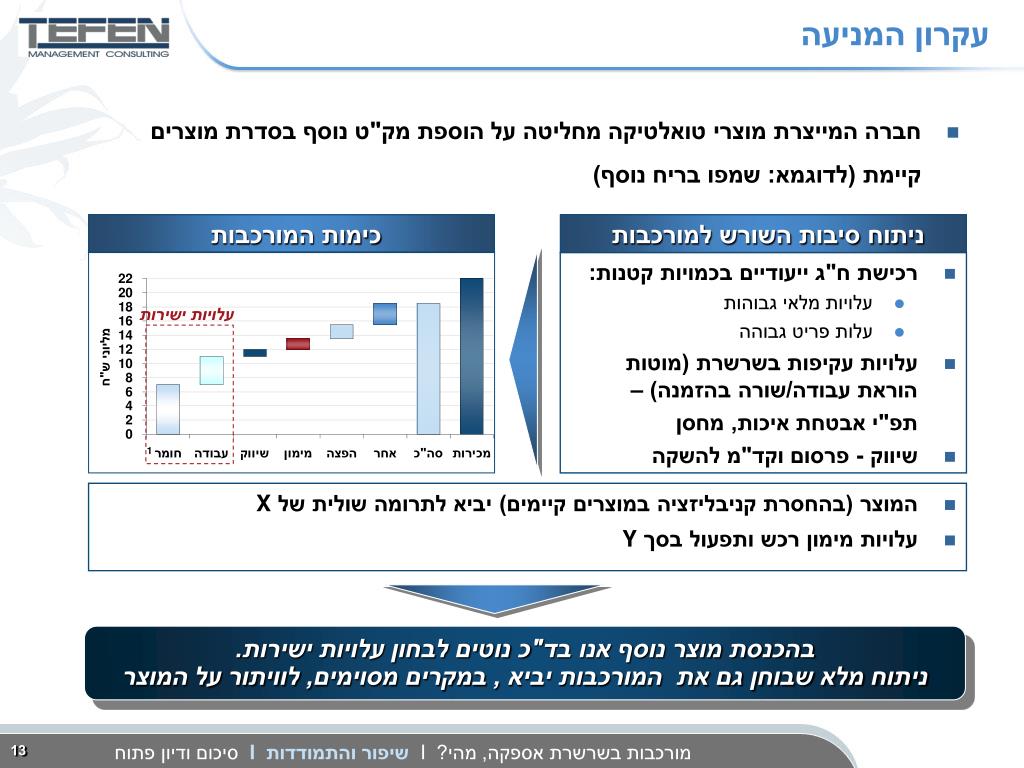 עקרון המניעה • חברה המייצרת מוצרי טואלטיקה מחליטה על הוספת מק"ט נוסף בסדרת מוצרים קיימת (לדוגמא: שמפו בריח נוסף) כימות המורכבות ניתוח סיבות השורש למורכבות • רכישת ח"ג ייעודיים בכמויות קטנות: • עלויות מלאי גבוהות • עלות פריט גבוהה • עלויות עקיפות בשרשרת (מוטות הוראת עבודה/שורה בהזמנה) – תפ"י אבטחת איכות, מחסן • שיווק - פרסום וקד"מ להשקה עלויות ישירות 1 • המוצר (בהחסרת קניבליזציה במוצרים קיימים) יביא לתרומה שולית של X • עלויות מימון רכש ותפעול בסך Y בהכנסת מוצר נוסף אנו בד"כ נוטים לבחון עלויות ישירות. ניתוח מלא שבוחן גם את המורכבות יביא , במקרים מסוימים, לוויתור על המוצר מורכבות בשרשרת אספקה, מהי? Iשיפור והתמודדות I סיכום ודיון פתוח