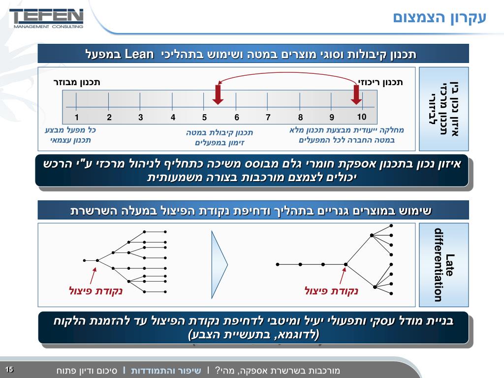 עקרון הצמצום תכנון קיבולות וסוגי מוצרים במטה ושימוש בתהליכי Lean במפעל איזון נכון בין תכנון מרכזי לביזורי תכנון מבוזר תכנון ריכוזי 10 1 2 3 4 5 6 7 8 9 כל מפעל מבצע תכנון עצמאי מחלקה ייעודית מבצעת תכנון מלא במטה החברה לכל המפעלים תכנון קיבולת במטה זימון במפעלים איזון נכון בתכנון אספקת חומרי גלם מבוסס משיכה כתחליף לניהול מרכזי ע"י הרכש יכולים לצמצם מורכבות בצורה משמעותית שימוש במוצרים גנריים בתהליך ודחיפת נקודת הפיצול במעלה השרשרת Late differentiation נקודת פיצול נקודת פיצול בניית מודל עסקי ותפעולי יעיל ומיטבי לדחיפת נקודת הפיצול עד להזמנת הלקוח (לדוגמא, בתעשיית הצבע) מורכבות בשרשרת אספקה, מהי? Iשיפור והתמודדות I סיכום ודיון פתוח