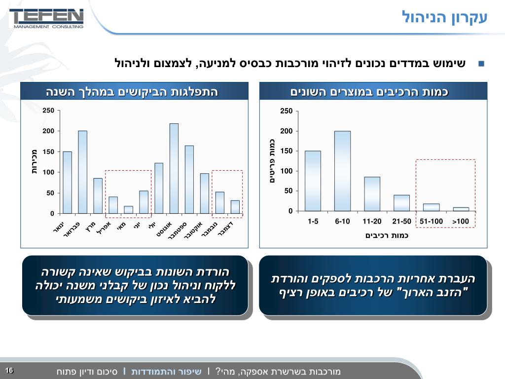 עקרון הניהול • שימוש במדדים נכונים לזיהוי מורכבות כבסיס למניעה, לצמצום ולניהול התפלגות הביקושים במהלך השנה כמות הרכיבים במוצרים השונים הורדת השונות בביקוש שאינה קשורה ללקוח וניהול נכון של קבלני משנה יכולה להביא לאיזון ביקושים משמעותי העברת אחריות הרכבות לספקים והורדת "הזנב הארוך" של רכיבים באופן רציף מורכבות בשרשרת אספקה, מהי? Iשיפור והתמודדות I סיכום ודיון פתוח