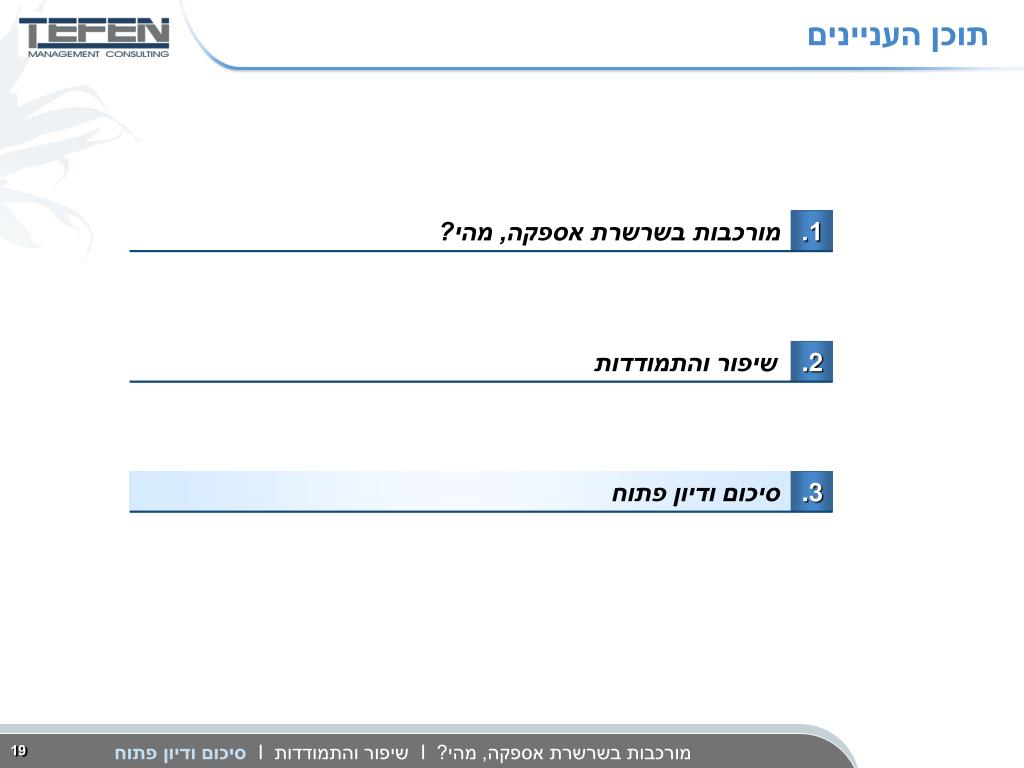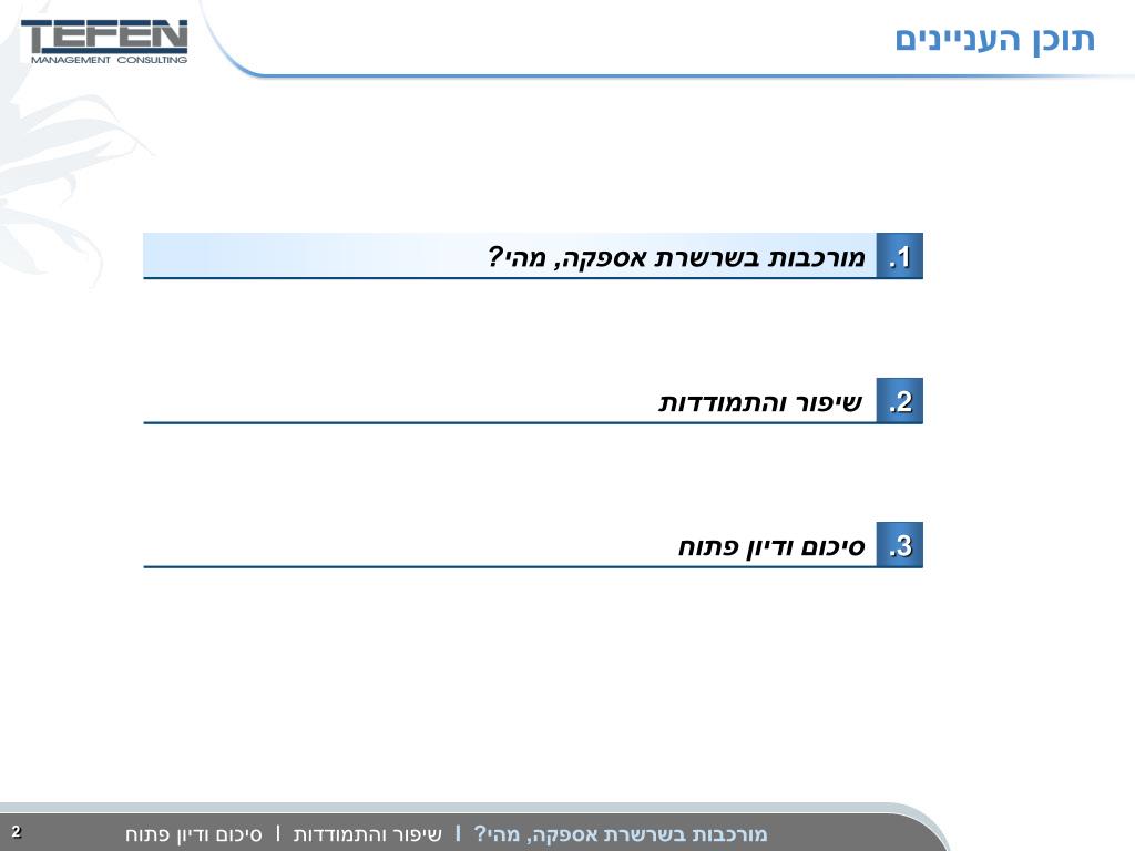 תוכן העניינים מורכבות בשרשרת אספקה, מהי? 1. שיפור והתמודדות .2 סיכום ודיון פתוח .3 מורכבות בשרשרת אספקה, מהי? Iשיפור והתמודדות Iסיכום ודיון פתוח