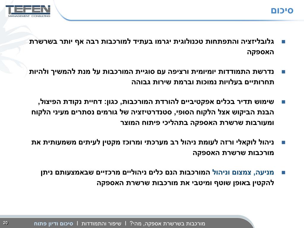 סיכום • גלובליזציה והתפתחות טכנולוגית יגרמו בעתיד למורכבות רבה אף יותר בשרשרת האספקה • נדרשת התמודדות יומיומית ורציפה עם סוגיית המורכבות על מנת להמשיך ולהיות תחרותיים בעלויות נמוכות וברמת שירות גבוהה • שימוש תדיר בכלים אפקטיביים להורדת המורכבות, כגון: דחיית נקודת הפיצול, הבנת הביקוש אצל הלקוח הסופי, סטנדרטיזציה של גורמים נסתרים מעיני הלקוח ומעורבות שרשרת האספקה בתהליכי פיתוח המוצר • ניהול לוקאלי ורזה לעומת ניהול רב מערכתי ומרוכז מקטין לעיתים משמעותית את מורכבות שרשרת האספקה • מניעה, צמצום וניהול המורכבות הנם כלים ניהוליים מרכזיים שבאמצעותם ניתן להקטין באופן שוטף ומיטבי את מורכבותשרשרת האספקה מורכבות בשרשרת אספקה, מהי? Iשיפור והתמודדות Iסיכום ודיון פתוח