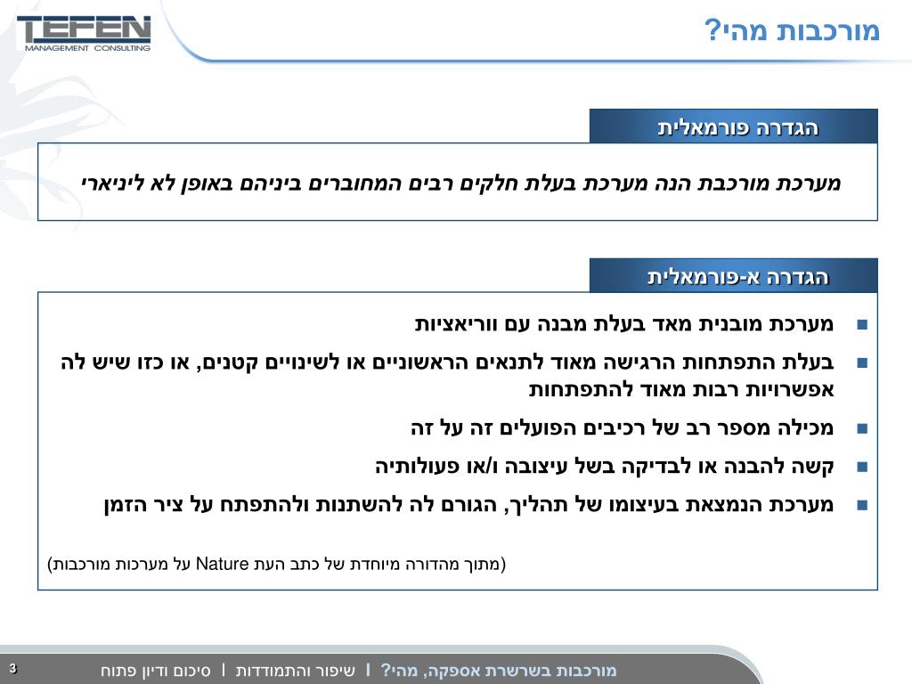 מורכבות מהי? מערכת מורכבת הנה מערכת בעלת חלקים רבים המחוברים ביניהם באופן לא ליניארי הגדרה פורמאלית הגדרה א-פורמאלית • מערכת מובנית מאד בעלת מבנה עם ווריאציות • בעלת התפתחות הרגישה מאוד לתנאים הראשוניים או לשינויים קטנים, או כזו שיש לה אפשרויות רבות מאוד להתפתחות • מכילה מספר רב של רכיבים הפועלים זה על זה • קשה להבנה או לבדיקה בשל עיצובה ו/או פעולותיה • מערכת הנמצאת בעיצומו של תהליך, הגורם לה להשתנות ולהתפתח על ציר הזמן (מתוך מהדורה מיוחדת של כתב העת Nature על מערכות מורכבות) מורכבות בשרשרת אספקה, מהי? Iשיפור והתמודדות I סיכום ודיון פתוח