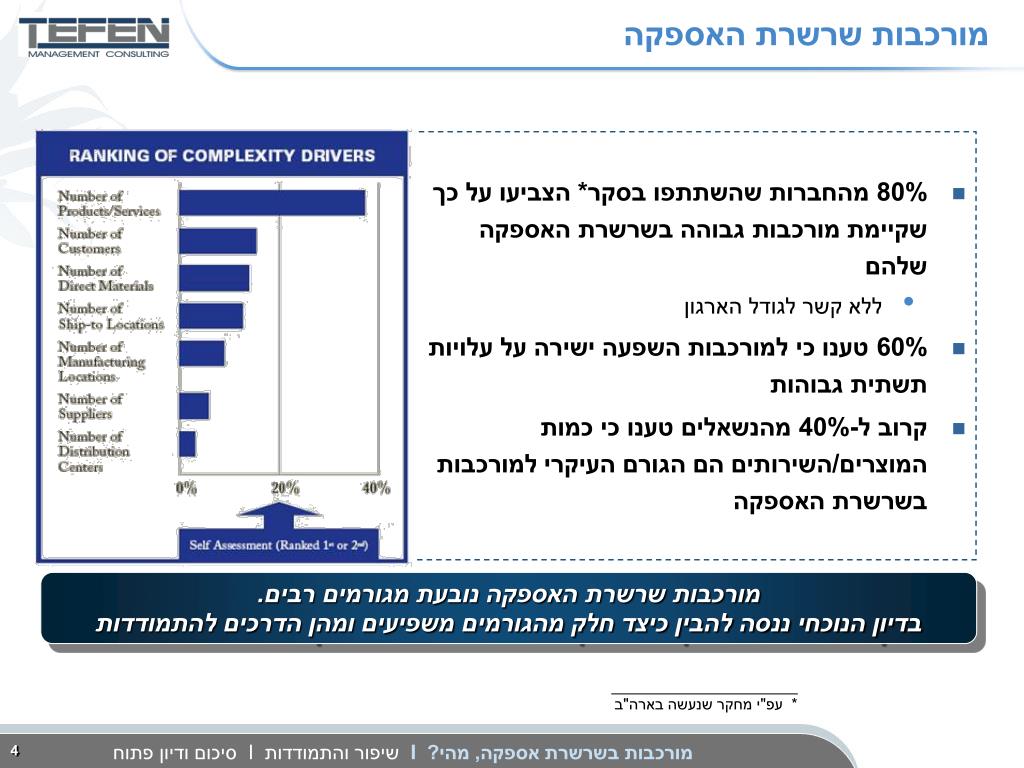 מורכבות שרשרת האספקה • 80% מהחברות שהשתתפו בסקר* הצביעו על כך שקיימת מורכבות גבוהה בשרשרת האספקה שלהם • ללא קשר לגודל הארגון • 60% טענו כי למורכבות השפעה ישירה על עלויות תשתית גבוהות • קרוב ל-40% מהנשאלים טענו כי כמות המוצרים/השירותים הם הגורם העיקרי למורכבות בשרשרת האספקה מורכבות שרשרת האספקה נובעת מגורמים רבים. בדיון הנוכחי ננסה להבין כיצד חלק מהגורמים משפיעים ומהן הדרכים להתמודדות * עפ"י מחקר שנעשה בארה"ב מורכבות בשרשרת אספקה, מהי? Iשיפור והתמודדות I סיכום ודיון פתוח