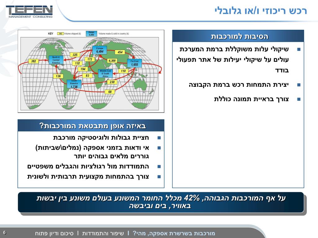 רכש ריכוזי ו/או גלובלי הסיבות למורכבות • שיקולי עלות משוקללת ברמת המערכת עולים על שיקולי יעילות של אתר תפעולי בודד • יצירת התמחות רכש ברמת הקבוצה • צורך בראיית תמונה כוללת באיזה אופן מתבטאת המורכבות? • חציית גבולות ולוגיסטיקה מורכבת • אי ודאות בזמני אספקה (נמלים\שביתות) גוררים מלאים גבוהים יותר • התמודדות מול רגולציות והגבלים משפטיים • צורך בהתמחות מקצועית תרבותית ולשונית על אף המורכבות הגבוהה, 42% מכלל החומר המשונע בעולם משונע בין יבשות באוויר, בים וביבשה מורכבות בשרשרת אספקה, מהי? Iשיפור והתמודדות I סיכום ודיון פתוח