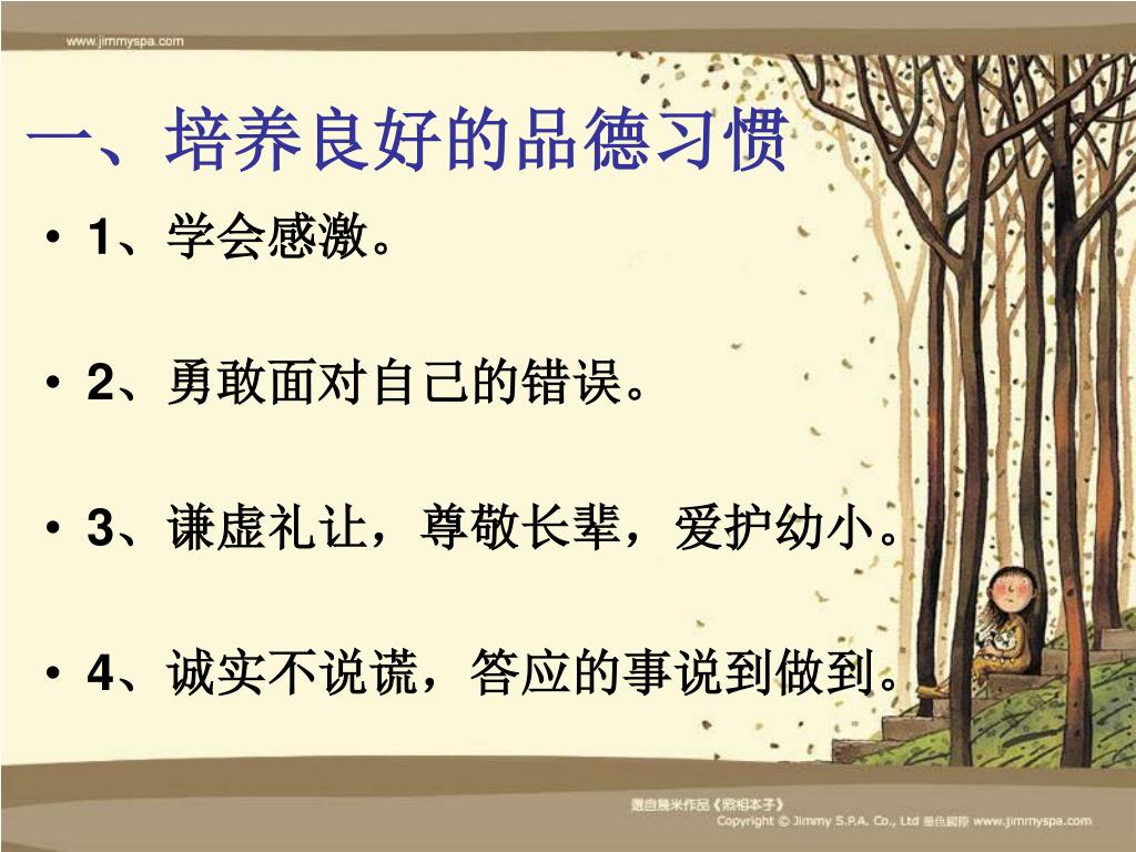 一、培养良好的品德习惯 • 1、学会感激。 • 2、勇敢面对自己的错误。 • 3、谦虚礼让,尊敬长辈,爱护幼小。 • 4、诚实不说谎,答应的事说到做到。