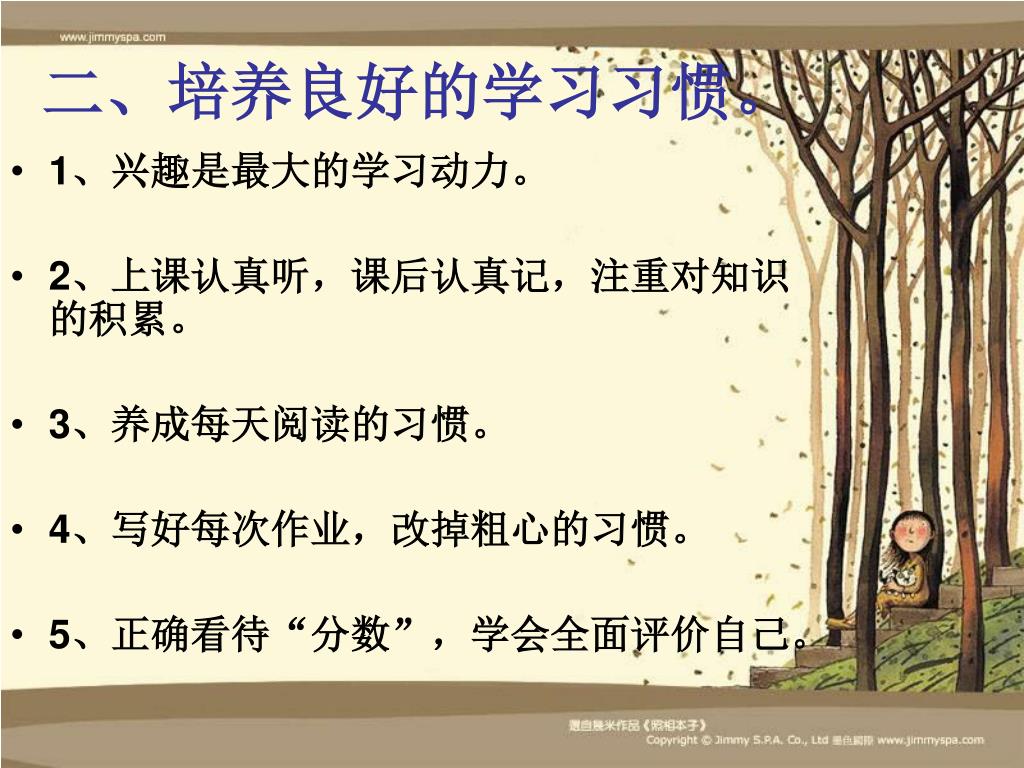 二、培养良好的学习习惯。 • 1、兴趣是最大的学习动力。 • 2、上课认真听,课后认真记,注重对知识的积累。 • 3、养成每天阅读的习惯。 • 4、写好每次作业,改掉粗心的习惯。 • 5、正确看待“分数”,学会全面评价自己。